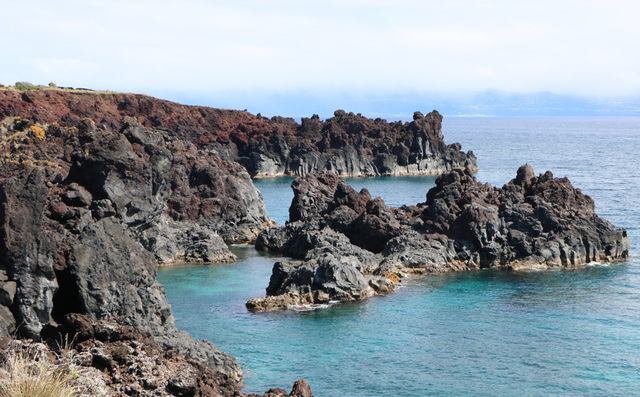Hoditi smo začeli blizu svetilnika na vzhodnem delu otoka Pico, ki ga zaradi črne vulkanske kamenine imenujejo tudi Črni otok. Pred nami je bil zelo zanimiv, dve uri dolg krožni pohod, ki v prvem delu poteka po razbrazdanih bazaltnih ploščah iz strnjene lave. Pot je označena za srednje zahtevno, prehode med skalami pa so nam kazale markacije v obliki rumenih in rdečih črtic. Gibanje po grobem vulkanskem terenu zahteva stabilno obutev, dobrodošle pa so tudi palice.