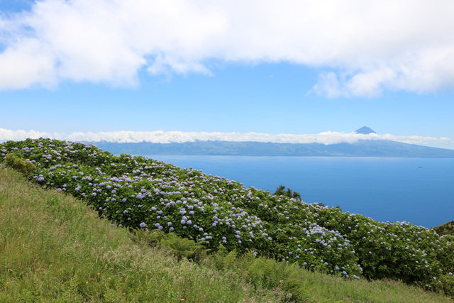 Čeprav so vetrovi z Atlantika gnali značilne oblake, je bil dež do nas milostljiv. Ob poti so nas spremljale žive meje iz cvetočih hortenzij, ki so jih na otočje v preteklosti prinesli pomorščaki. Na Azorih veljajo za invazivno vrsto, a danes si brez teh razkošnih lepotic v modrih in rožnatih odtenkih ne znamo predstavljati te presunljivo lepe pokrajine. Z njimi razmejujejo parcele, saj jih živina ne mara. Prinesli so tudi druge sicer lepe, a invazivne vrste, ki negativno vplivajo na otoško biotsko raznovrstnost in zato kličejo po nadzoru.
